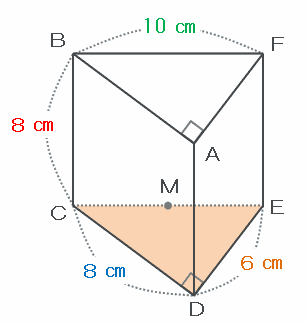 直角三角形CDEを底面としてこの展開図を組み立ててみると、次の図のような三角柱ができます。