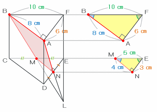 次の図の三角すいL-FBAとL-EMNはどちらも底面積と高さが分かったので、体積をそれぞれ求めてみると、