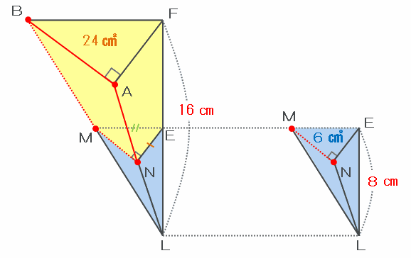 つまり、辺MNはBAの半分にあたる4㎝、辺ENはFAの半分にあたる3㎝なので、三角形BAFの面積は8×6÷2=24㎠、MNEの面積は4×3÷2=6㎠です。