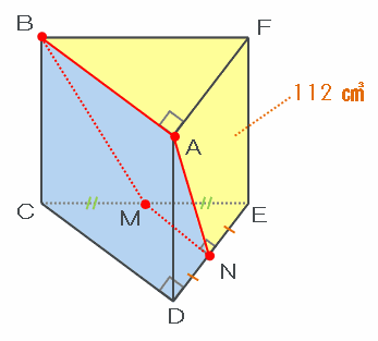 三角柱を切断するために辺BAからナイフを入れて点Mに向けてスパッと切断するとき、切断面は点Nも含めた台形BMNAになります。