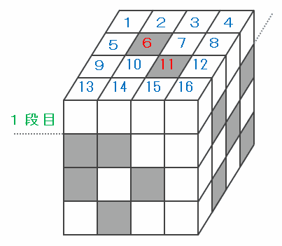 この立方体にあるすべての積み木へ、次の図のように最上段の左上から番号を付けてみると、最上段には黒い積み木が「6番」と「11番」の2個あります。