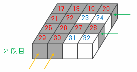 2段目の積み木を正面から見ると、次の図のように「29番」と「30番」は黒い積み木なので、その2列にある4×2=8個の積み木はすべて黒色です。