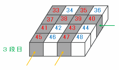 3段目の積み木を正面から見ると、次の図のように「45番」と「47番」は黒い積み木なので、その2列にある4×2=8個の積み木はすべて黒色です。
