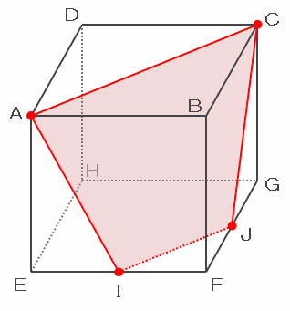 立方体の辺EFの中点をI、辺FGの中点をJとして、辺IJに下からナイフの刃を当てて、点Cを通過するように上へスパッと突き抜けたとき、切断面は次の図のような台形IJCAになります。