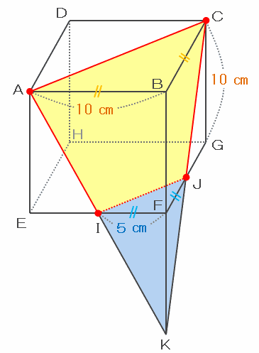 次の図のように、辺AIとCJとBFの3本を下へ向けて延長すると点Kで交わり、小さな三角すいKFJIと大きな三角すいKBCAができます。