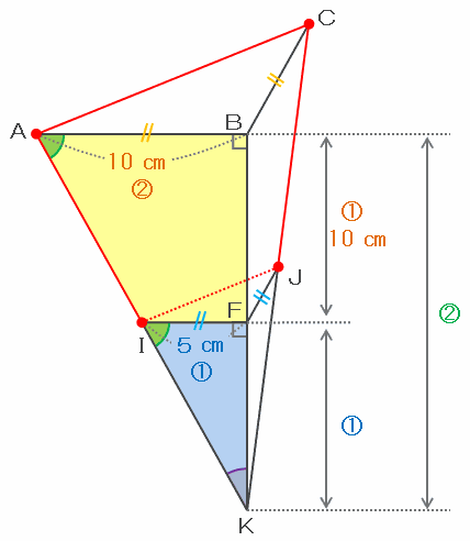 次の図の三角形KIFとKABは内角の関係から相似であり、長さの比はIF:AB=5㎝:10㎝=1:2です。