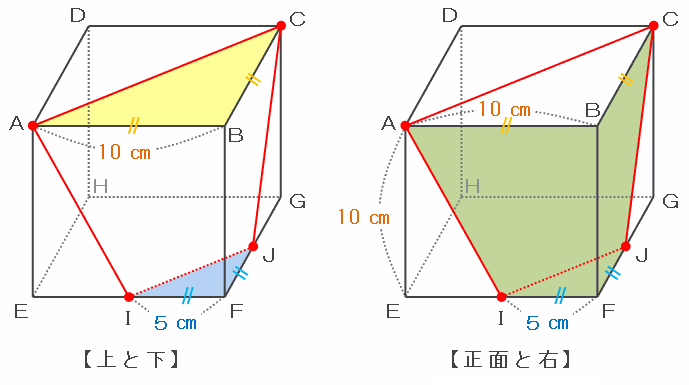 上の図の辺BFはもともと立方体の1辺なので、長さは10㎝です。