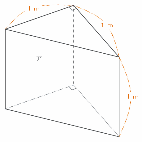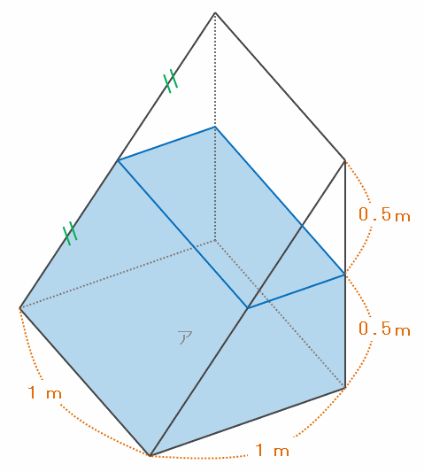 この三角柱をアの面を底面にして置き、水を深さ0.5mまで入れると、次のような図になります。