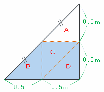 水を深さ0.5mまで入れた立体を三角形の面から見ると、次の図のA~Dのような4つの小さな直角二等辺三角形に分けることができます。