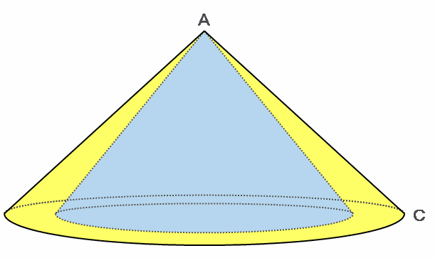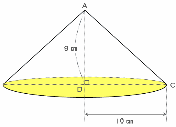 三角形ABCが辺ABを軸として1回転すると、次の図のような円すいができあがります。