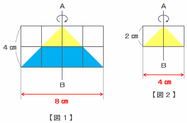 同じように図2の軸ABを回転させると、底面の直径が4㎝(半径は2㎝)で高さは2㎝の円すいができ、その体積は2×2×3×2÷3=8㎤になります。