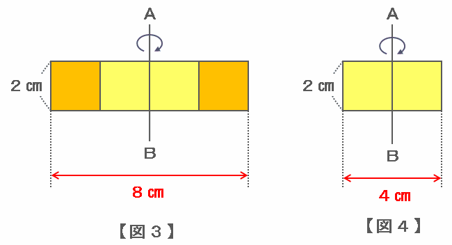 下の図3の軸ABを回転させると、底面の直径が8㎝(半径は4㎝)で高さは2㎝の円柱ができ、その体積は4×4×3×2=96㎤になります。