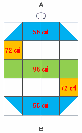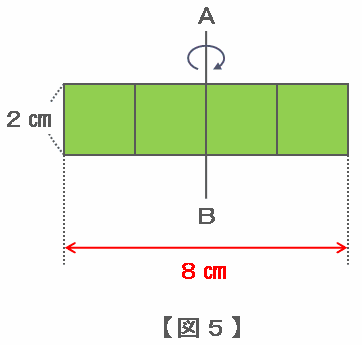下の図5の軸ABを回転させると、底面の直径が8㎝(半径は4㎝)で高さは2㎝の円柱ができ、その体積はさっきの図3のときと同じく96㎤になります。