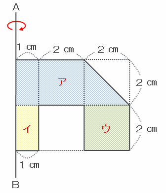 次の図のように、軸ABの右側をア・イ・ウの3か所に分け、ABを回転させたときにそれぞれの立体の体積が何㎤になるのかを求め、最後にそれを足せばOKです。