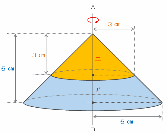 次の図のように軸ABを1回転させると、エは底面の半径と高さがどちらも3㎝の円すい、そして「エとアを合わせた形」は底面の半径と高さがどちらも5㎝の円すいになります。