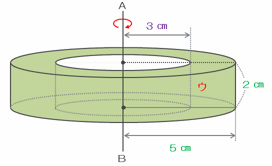 ウを1回転させると、次の図のようなドーナツ型の立体ができるので、その体積を求めるには、底面の半径が5㎝、高さが2㎝の円柱の体積から、底面の半径が3㎝、高さが2㎝の円柱の体積を引けばOKです。