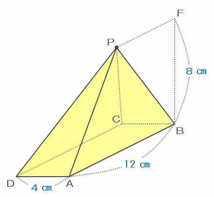 四角すいPABCDは、次の図のように辺DAが4㎝、辺ABが12㎝、そして高さが8㎝です。