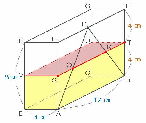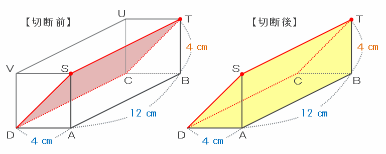 次の図のように、直方体を底面から高さ4㎝のところにあるピンク色の平面STUVで切断し、上半分はゴミ箱にポイすると、残った下半分の体積は4×12×4=192㎤になります。
