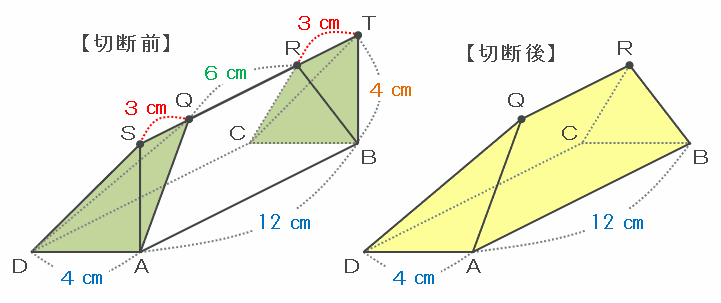 つまり、立体QRABCDの体積は上の図の切断前の三角柱の体積である96㎤から、合同な緑色の三角すい2個分の体積にあたる8×2=16㎤を引けば求められるので、答えは96-16=80㎤になります。