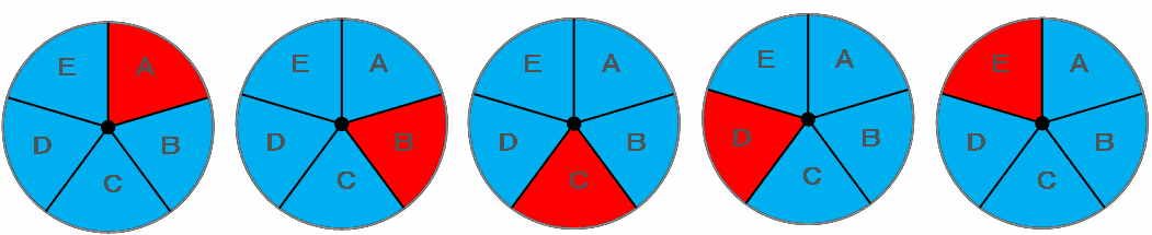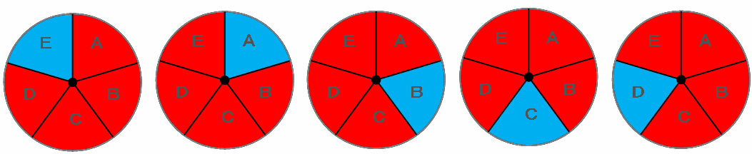 1か所だけ赤くぬる場合、その場所はAからEまでの5か所から選べるので、次の図のように全部で5通りになります。