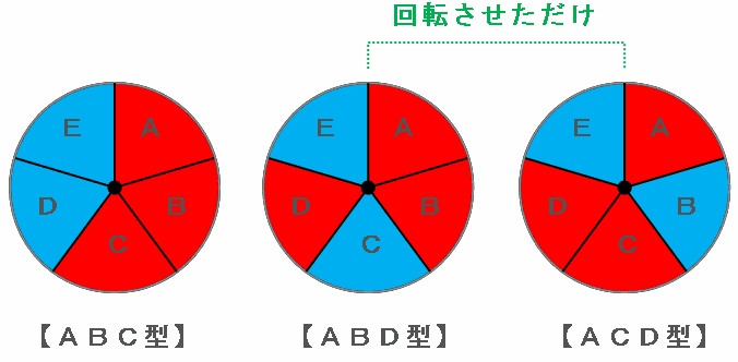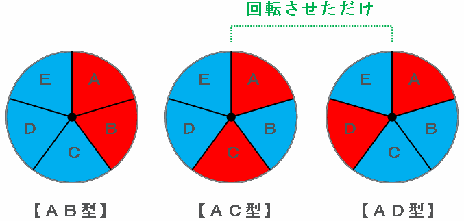 ただし、AD型はAC型をクルッと回転させただけなので、2か所を赤くぬる方法は全部で2通りになります。