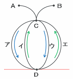 上の図の曲線アイウエをすべて通り終えたときにCにいるためには、4本の曲線をCから出発して「下向き→上向き→下向き→上向き」の順に進めばOKです。