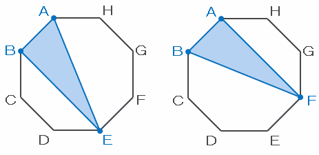 このような直角二等辺三角形は、正八角形の頂点1つに対して1個ずつ作れるので、直角二等辺三角形は全部で8個できます。