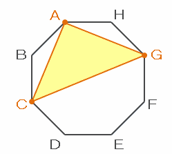 また次の図のように、頂点Aと、その両側の1個飛ばしの位置にあるCとGを選んで直線で結ぶと、直角二等辺三角形ACGができます。