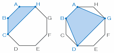 次の図のように、正八角形にある8個の頂点から1個飛ばしで4個選んで直線で結ぶと正方形ができます。