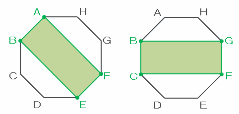 正八角形の内部に長方形を作るには、次の図の「辺ABとEF」や「辺BCとFG」のように、向かい合わせの関係にある2辺を選んで直線で結べばOKです。