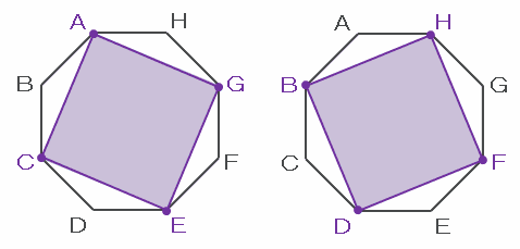 また、そのような頂点の選び方は下の図の「ACEG」と「BDFH」の2種類しかないので、正八角形の内部に正方形は2個作れます。