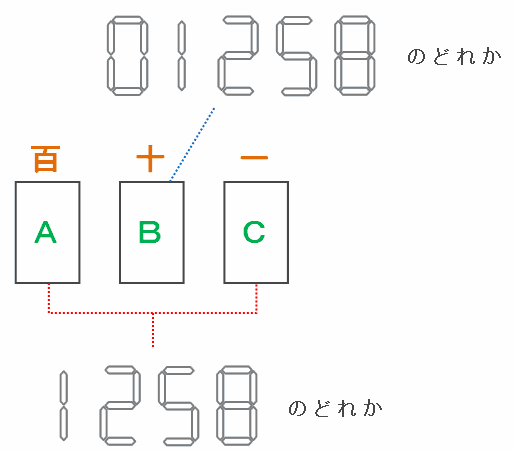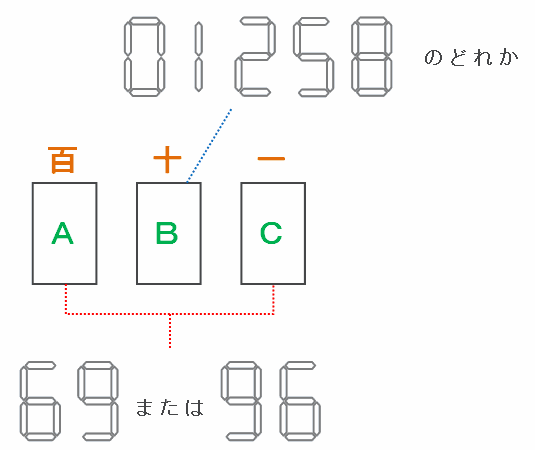 そこで下の図のように、AとCの組み合わせを「6と9」または「9と6」にしてあてはめ、残ったBには「0・1・2・5・8」の中からどれか1つを選んで使います。