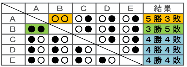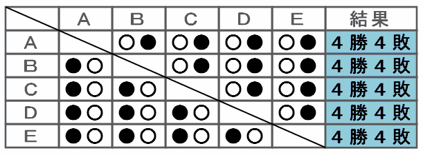 ただ、もしAからEの5人の実力がほぼ同じ場合、次のリーグ表のように全員が4勝4敗ということもあり得ます。