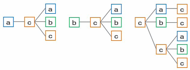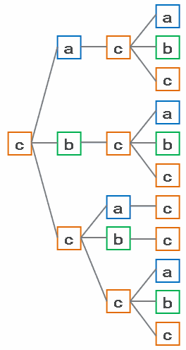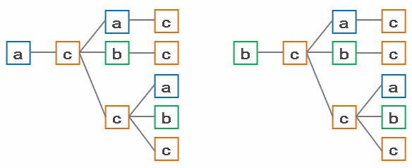 a、b、cからスタートして3個並べた場合の並べ方を樹形図で表すと、それぞれ次のような図になります。