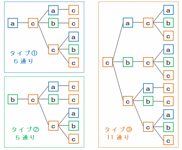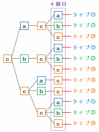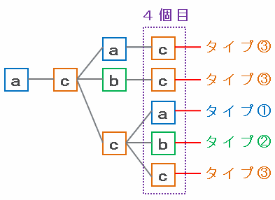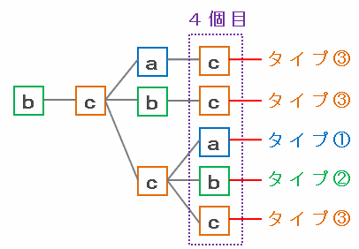上の図の4個目がbならそこからタイプ②を、cならタイプ③をスタートさせることができるので、aから始めた場合はタイプ①とタイプ②が1個ずつ、そしてタイプ③が3個できることが分かります。
