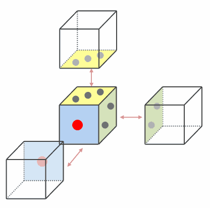 ※ 1の目は真後ろ、2の目は底面、3の目は左側に来る。