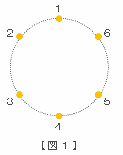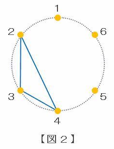 次の図1のように、円周の6等分点に1から6までの番号がついています。6等分点のうち、さいころを投げて最初に出た目の数の番号の点から始めて、さいころを投げて出た目の数の番号の点を順に結んで折れ線を作ります。折れ線全体が1つの三角形の周になるとき、「折れ線は1つの三角形になる」と呼ぶことにします。