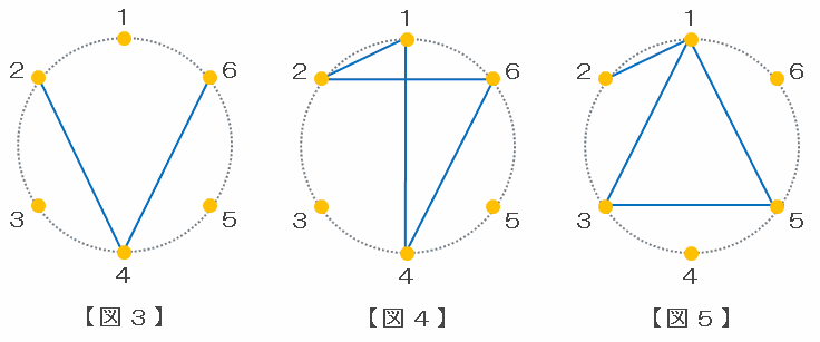 2、4、6、4、6のとき、1、4、6、2、1のとき、1、3、5、1、2のときは、それぞれ図3、図4、図5のようになり、折れ線は1つの三角形になりません。
