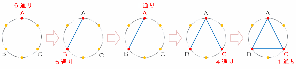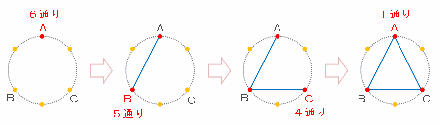 上の図の点A(1回目)の選び方は1から6の6通り、点B(2回目)の選び方はA以外の目ならOKなので5通り、そして点C(3回目)の選び方はAとB以外の目ならOKなので4通りあります。