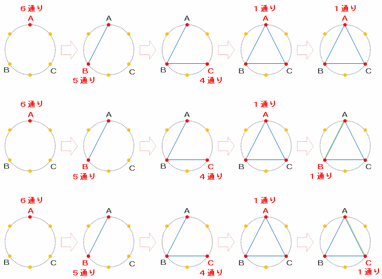 つまりサイコロを5回振る場合も、3つの点のどこかで1回途中下車して「A→A→B→C→A」、「A→B→B→C→A」、「A→B→C→C→A」のように進めば、3つの点を「A→B→C」の順に選び、最後にCとAを結んで三角形を作ることができます(次の図参照)。