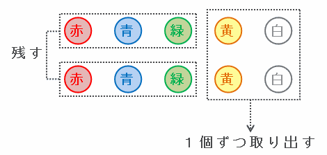 ・「赤・青・緑」、「緑・黄・白」、「赤・青・黄」を1組ずつ取り出す