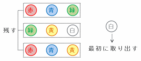・まずは白い玉1個を「赤・赤・白」の組み合わせで取り出す(赤2個は戻す)