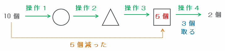 また、操作1から3までの3回で、袋の中の玉は10-5=5個減ったことも分かります。