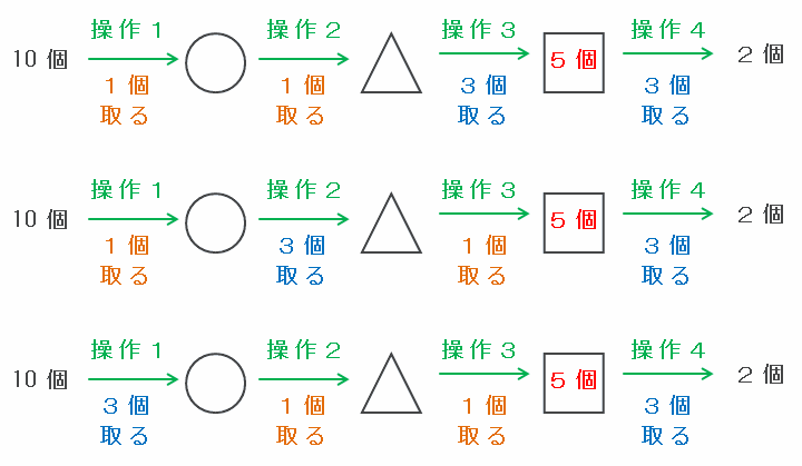 ・「3個減る→1個減る→1個減る」のとき→○は10-3=7個、△は7-1=6個