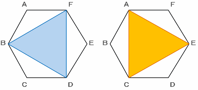 正六角形の頂点を1個飛ばしに3個選んで結ぶと、次の図のような大きい正三角形BDFとACEができます。