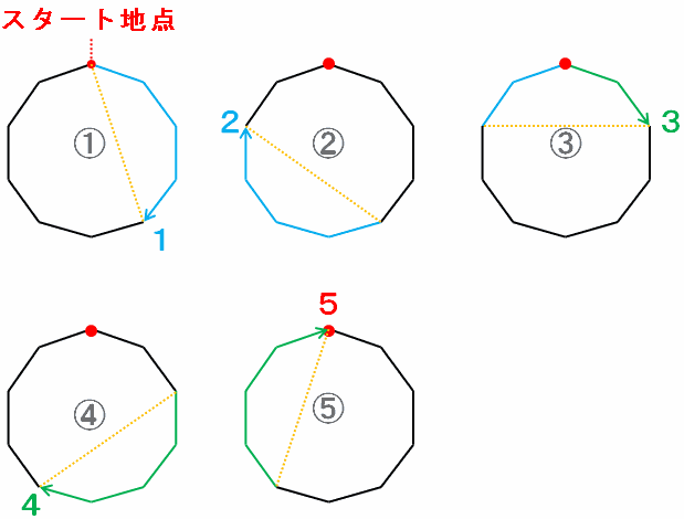 正十角形の真上にある頂点をスタート地点として、そこから時計回りに4個ずつ頂点を進んでいくと、次の図のようにちょうど2周目でスタート地点に戻り、途中で止まるたびにオレンジ色の直線(出発点と止まった場所を結んだ対角線)が5本引けます。