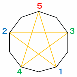 その結果、スタートからゴールするまでに途中で引いた5本の対角線によって、正十角形の中に次のような☆型の図形ができるのですが、そもそもなんでちょうど2周したときにスタート地点に帰ってくるのかというと・・・
