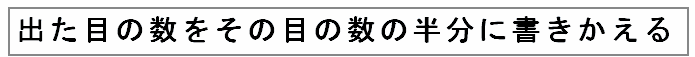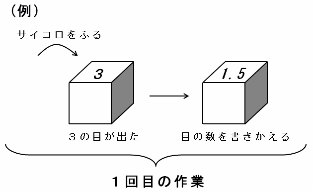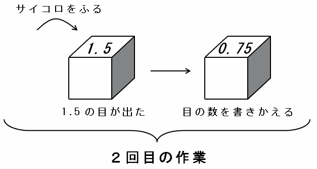 たとえば下の(例)のように、サイコロをふって3の目が出たら1.5に書きかえます。さらに、このサイコロをふって1.5の目が出たら0.75に書きかえます。