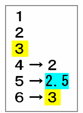 サイコロの目の合計をなるべく小さくするために、まずは「6」「5」「4」などの大きい数を半分の数に書きかえると、それぞれ「3」「2.5」「2」となります。