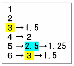 上の図にある2つの「3」が最も大きい数なので、どちらも半分の数である「1.5」に書きかえます。